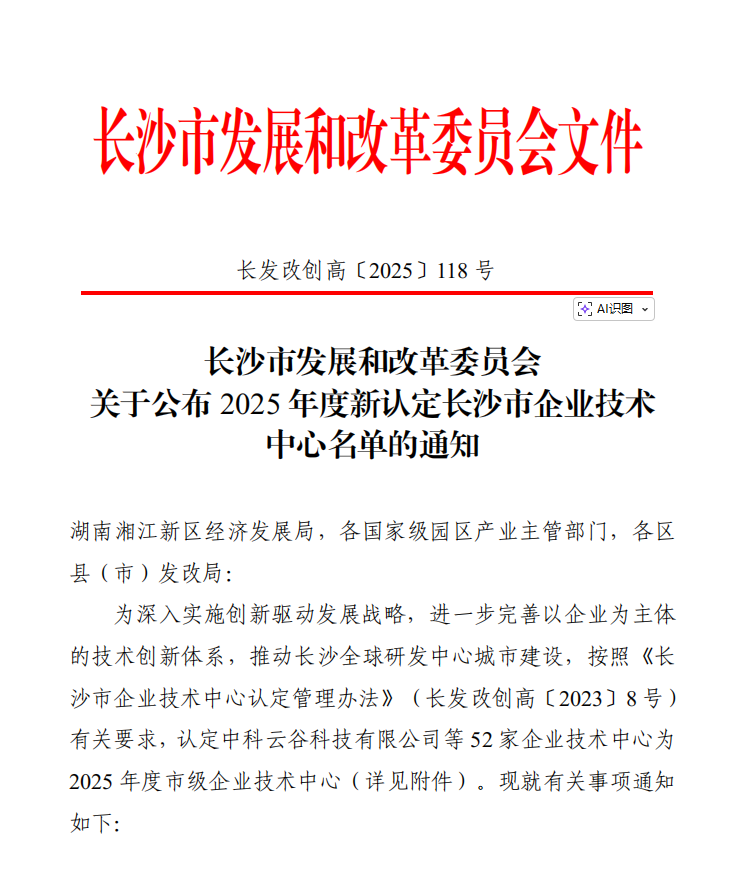 2025年12月31日,长沙市发展和改革委员会下发《关于公布 2025 年度新认定长沙市企业技术中心名单的通知》(长发改创高〔2025〕118号)文件,认定 52 家企业技术中心为2025 年度市级企业技术中心,开福区2家企业获评,湖南红船科技有限公司凭借较强的技术创新能力、优秀的创新技术成果获准认定。