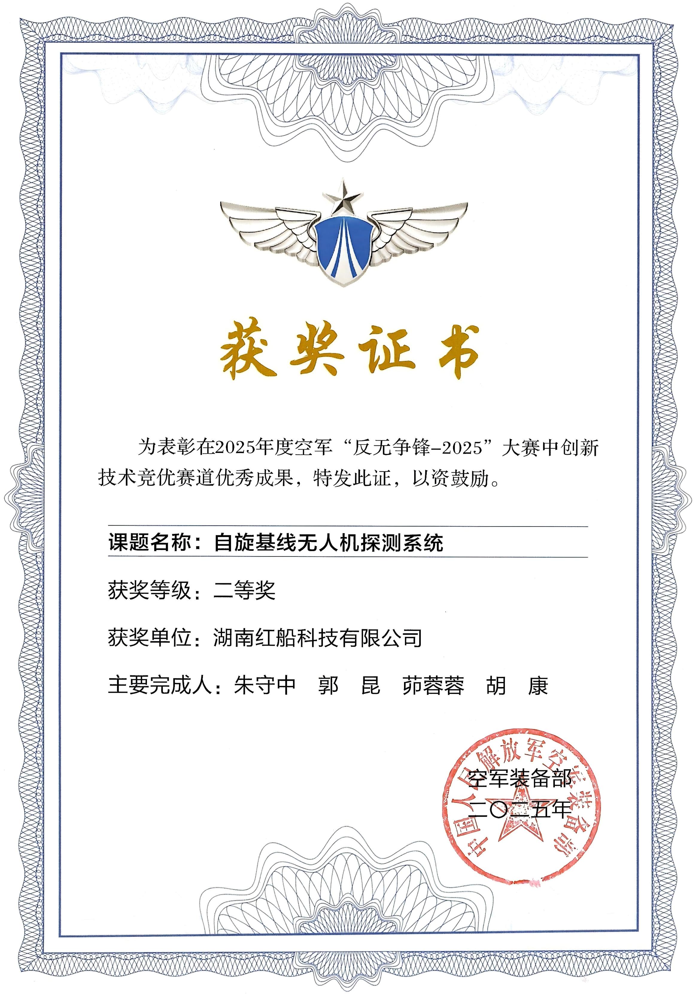 热烈祝贺湖南红船科技有限公司“自旋基线无人机探测系统”在2025年度空军“反无争锋-2025”大赛中荣获二等奖!